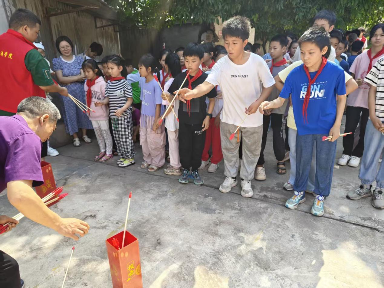 投壶挑战:现场还原古代投壶场景,孩子们手持箭矢,屏气凝神瞄准目标,投中时的欢呼与未中时的惋惜交织,氛围热烈。