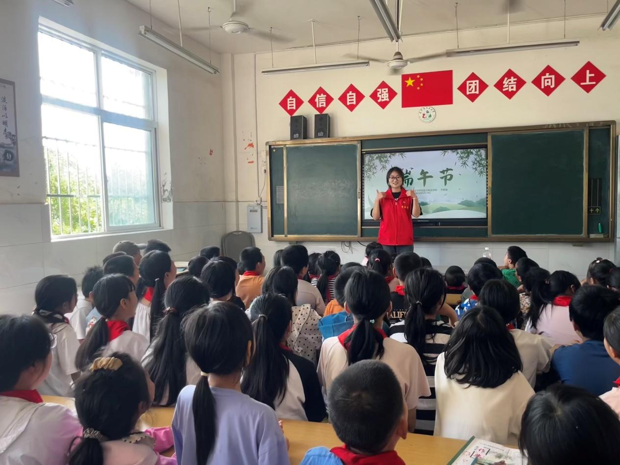 活动开始,入党积极分子宋雅璇化身传统文化“讲解员”,以生动有趣的语言、丰富多样的图片,为小学生们讲述端午节的起源、屈原的爱国故事以及挂艾草、赛龙舟、吃粽子等传统习俗。互动问答环节中,孩子们积极举手,踊跃参与,现场气氛热烈,在寓教于乐中感受传统文化的魅力。