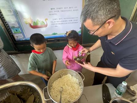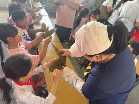 党员教师与小学生们两两结对、默契配合。党员教师化身耐心的 “生活导师”,从粽叶折叠成漏斗状、均匀铺放糯米,到精巧缠绕捆扎,以手把手教学、面对面示范的方式,将包粽子的每道工序拆解成易懂易学的步骤。孩子们专注聆听、跃跃欲试,一双双小手笨拙却认真地模仿着老师的动作,尽管包出的粽子形状或大或小、松紧不一,但每一个都凝聚着他们的专注与热情。粽叶的清香、糯米的米香在空气中弥漫,孩子们的欢笑声与党员教师的鼓励声交织,勾勒出一幅温情满满的节日画卷,让传统民俗文化的温暖与党组织的关怀浸润每个孩子心间。