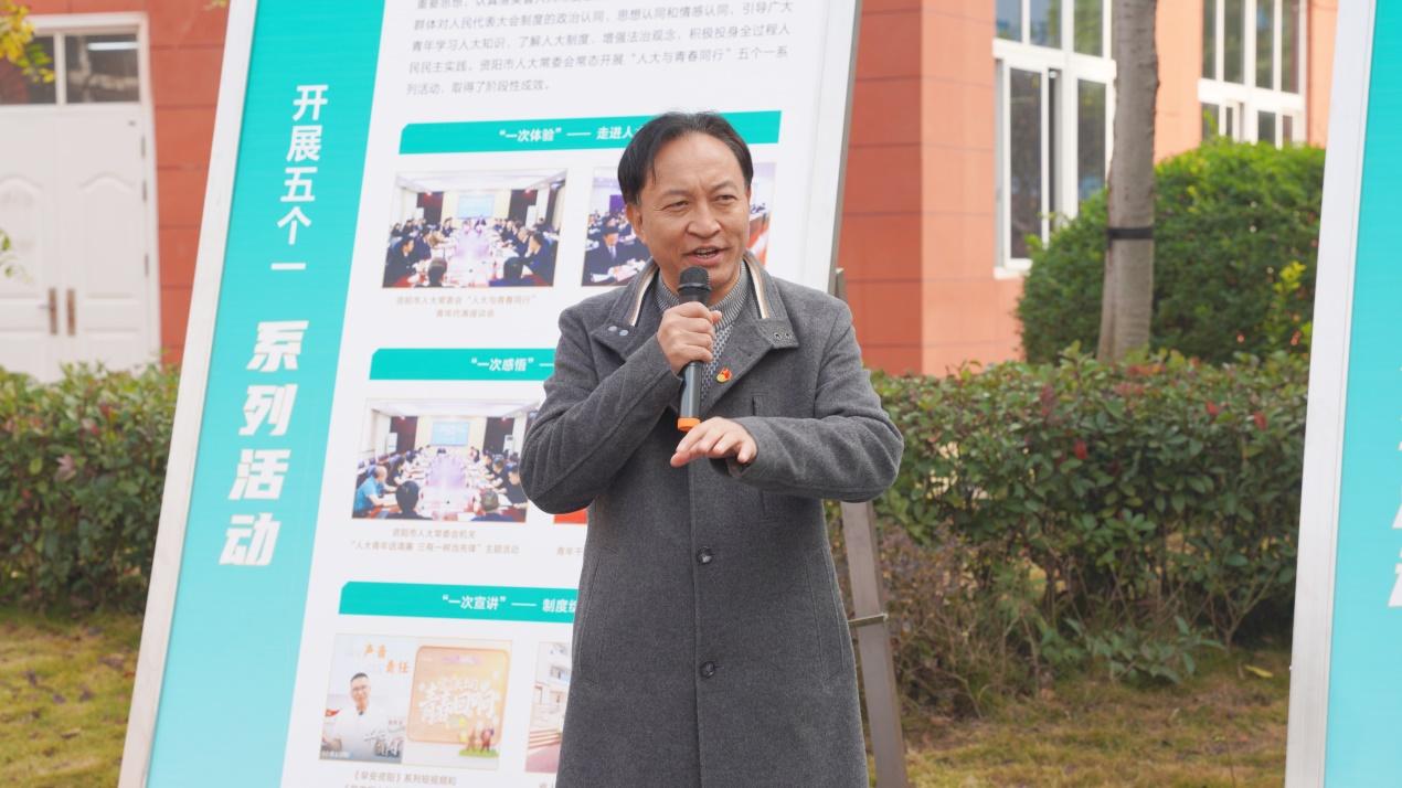 设于学术报告厅的“人大与青春同行”主题图片展,有人大代表深入基层了解群众需求的履职场景,有开展立法调研的生动画面,它们生动展现了资阳人大常委会以法定程序将党的主张化为国家意志。市人大常委会青年代表李雪以生动的讲解,结合资阳实践,为在场师生系统梳理了人民代表大会制度的历史脉络、显著优势与本地实践,共同近距离感悟全过程人民民主的丰富内涵。